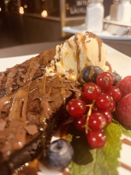 mit Haselnusseis, Karamellsoße und Schokosoße
