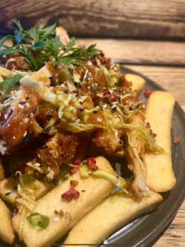 Goldene Fries mit zartem, in Sweet-Chili eingelegtem und paniertem Hähnchen, frischem Spitzkohl, Lauchzwiebeln und geröstetem Sesam.