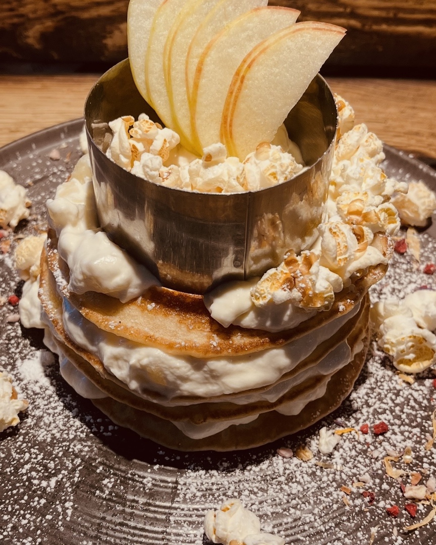 Vier fluffige Pancakes stapeln sich mit einer sahnigen Frischkäsecreme und feinen Apfelstücken.