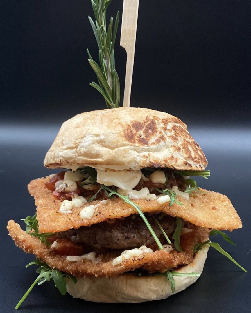 Sauerteigbrötchen trifft auf knusprig frittierte Lasagneblätter, saftigen Beefpatty, würzige Bolognese, cremige Aioli, Rucola und zart schmelzenden Mozzarella.